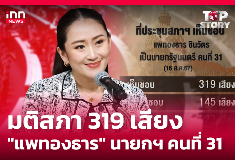 มติที่ประชุมสภาผู้แทนราษฎรท่วมท้น 319 เสียง เห็นชอบให้นางสาวแพทองธาร ชินวัตร แคนดิเดตจากพรรคเพื่อไทยเป็นนายกรัฐมนตรีคนที่ 31 ขณะ สส. พรรคไทยสร้าง ทั้ง 6 คน จากพรรคร่วมฝ่ายค้านย้ายฝั่งมาลงมติเห็นชอบกันทั้งพรรค ด้าน พรรคร่วมรัฐบาลแห่แสดงความยินดี
