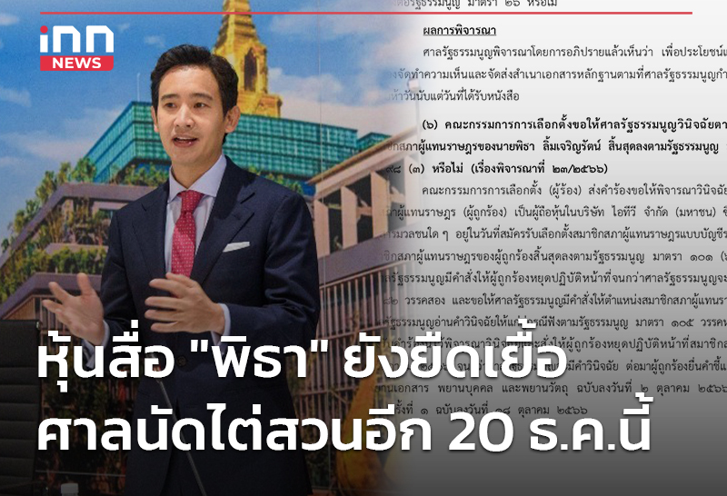 คดีหุ้นสื่อ "พิธา" ยังยืดเยื้อ ศาลรัฐธรรมนูญ นัดพิจารณาโดยการอภิปราย และเห็นควรไต่สวนพยานบุคคลต่อไป โดยกำหนดวันนัดไต่สวนพยานบุคคล ในวันพุธที่ 20 ธ.ค.นี้