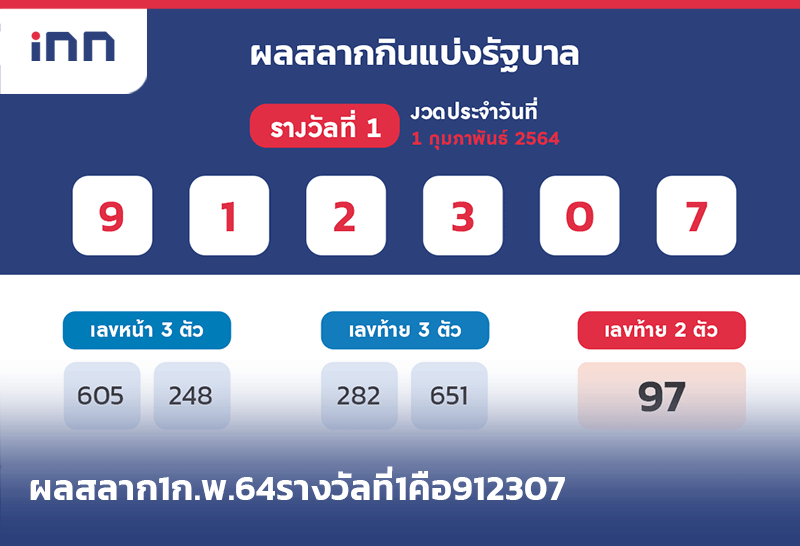 ผลสลาก1ก.พ.64รางวัลที่1คือ912307เลขท้ายสองตัว97เลขหน้าสามตัว605 ,248เลขท้ายสามตัว 282 ,651