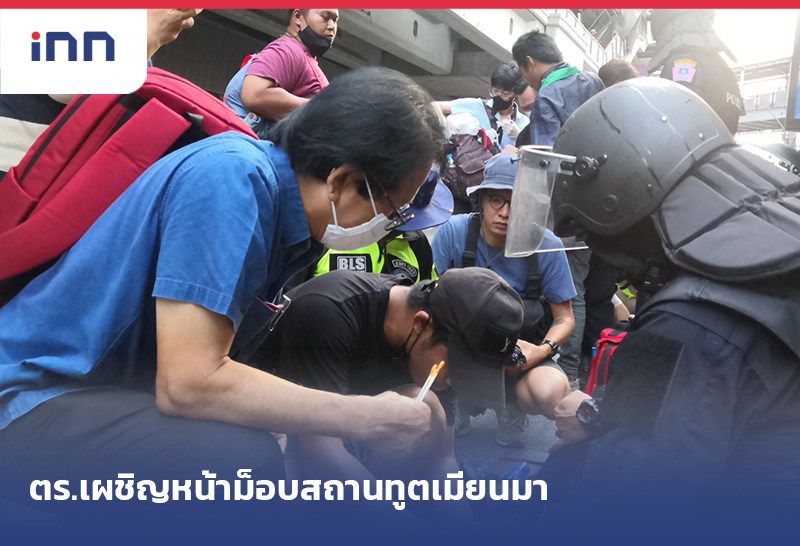 ตร.เผชิญหน้ากลุ่มผู้ชุมนุมหน้าสถานทูตเมียนมา เกิดเสียงดังคล้ายระเบิด 3 ครั้ง