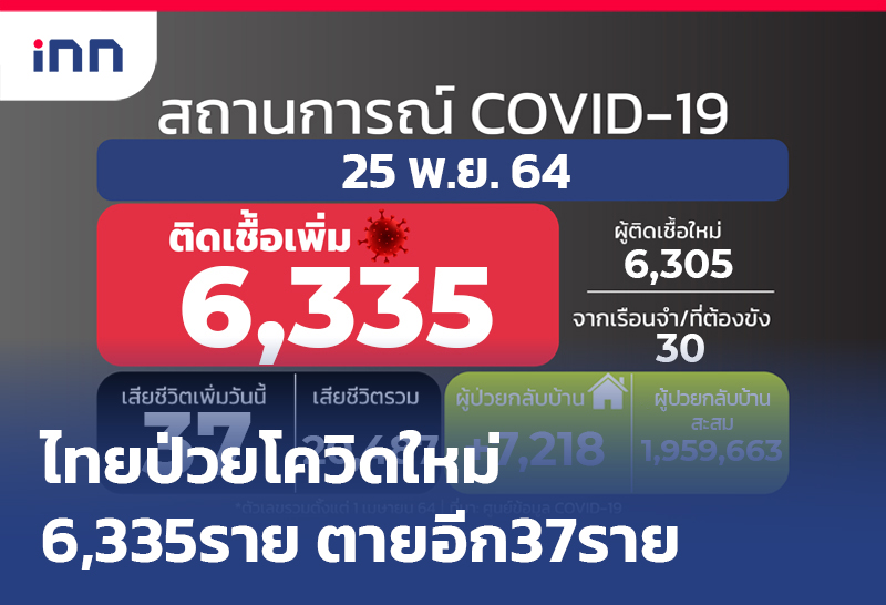 เพิ่มเล็กน้อย!ป่วยโควิดใหม่ 6,335 ราย สะสม 2,088,327 ราย ไม่นับ ATK อีก 2,391 ราย ขณะเสียชีวิตลดลง 37 ราย รักษาหาย 7,218 ราย เหลือรักษาตัวใน รพ. 80,657 คน