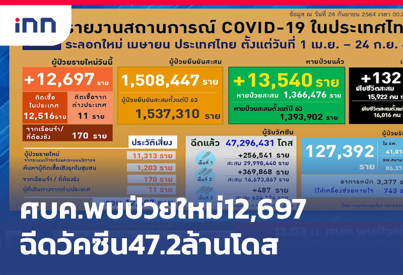 ศบค.พบป่วยใหม่ 12,697 ราย ตายเพิ่ม 132 คน รักษาหายกลับบ้านแล้ว 1,393,902 ราย ยังรักษาอยู่ 127,392 ราย