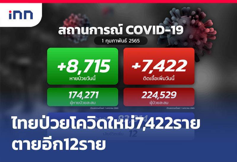 ลดแล้ว! ไทยป่วยโควิดใหม่ 7,422 ราย ในประเทศ 7,161 ราย มาจากต่างประเทศ 261 ราย เสียชีวิต 12 ราย ขณะรักษาหาย 8,715 ราย เหลือรักษาตัว ในรพ.83,014 คน