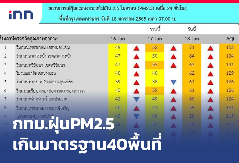 กทม. PM2.5 เกินมาตรฐาน 40 พื้นที่ คุณภาพอากาศเริ่มกระทบต่อสุขภาพ