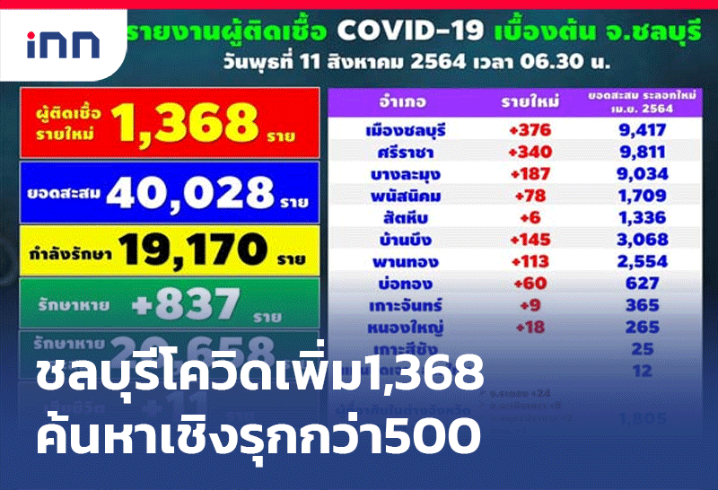 จังหวัดชลบุรีพบผู้ติดเชื้อโควิด-19เพิ่ม1,368 ค้นหาผู้สัมผัสทั้งหมด1,061 ขณะค้นหาเชิงรุกเบื้องต้นกว่า500