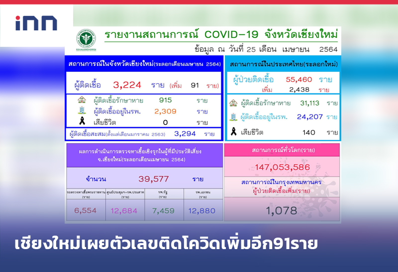 เชียงใหม่ เผยตัวเลขผู้ติดเชื้อรายใหม่ 91 ราย สะสมเพิ่มเป็น 3,224 ราย