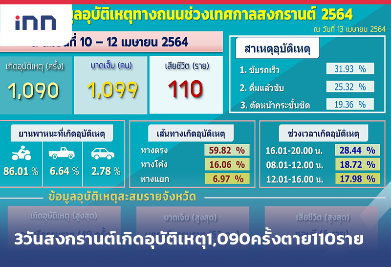 ศปถ.เผย 7 วัน อันตราย 3 วันเกิดอุบัติเหตุ 1,090 ครั้งเสียชีวิตแล้ว 110 ราย บาดเจ็บ 1,099 คน