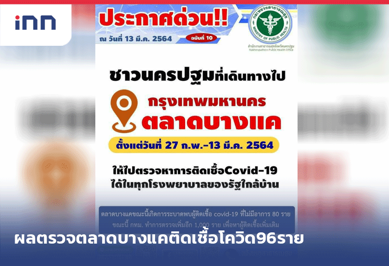 กทม.เผยผลตรวจเชิงรุกตลาดในพื้นที่บางแค ช่วง7-13 มี.ค ตรวจทั้งหมด 4,046ราย ติดเชื้อ 96