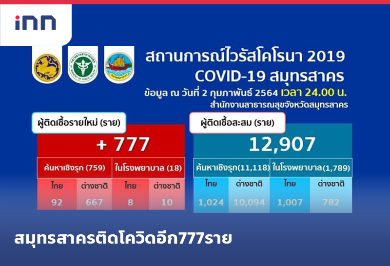 สมุทรสาครติดโควิด-19 พุ่งอีก 777 ราย สะสม 12,907 รอผลอีก 11,867 เคส