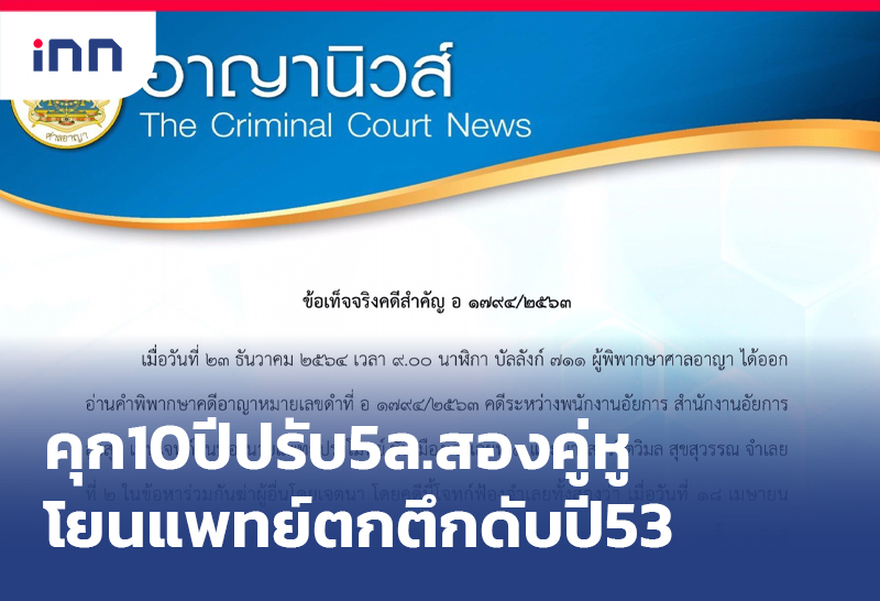 ปิดฉากคดีดัง! ศาลสั่งจำคุก 10 ปี ปรับ 5 ล้าน พร้อมดอกเบี้ย คดีสองเพื่อนสนิทโยนแพทย์ตกตึกดับ ปี 2553ศาลเชื่อมิใช่เหตุชู้สาว