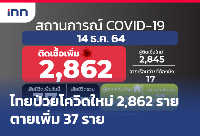 ลดลงต่อเนื่องป่วยโควิดใหม่ 2,862 ราย ไม่นับ ATK อีก 2,471 ราย สะสม 2,174,906 ราย ขณะเสียชีวิตเพิ่ม 37 ราย รักษาหาย 4,818 ราย เหลือรักษาตัวใน รพ. 47,531 คน