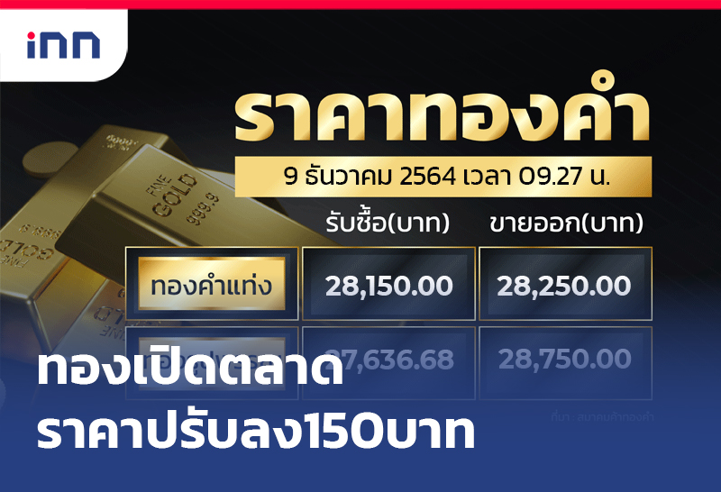 สมาคมค้าทองคำ ประกาศราคาปรับลง 150 บาททองคำแท่ง รับซื้อบาทละ 28,150 บาท ขายออกบาทละ 28,250 บาท ทองรูปพรรณ รับซื้อบาทละ 27,636.68 บาท ขายออกบาทละ 28,750 บาท
