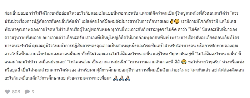 “ก่อนอื่นขอบอกว่าไม่ได้โกรธหรืออ่อนไหวอะไรกับคอมเมนต์แบบนี้หรอกนะครับ แต่ผมก็คิดว่าตนเป็นผู้ใหญ่คนหนึ่งที่สั่งสอนคนได้ว่า “ควรปรับปรุงเรื่องการปฏิสันถารกับคนอื่นได้แล้ว” แม้แต่คนใกล้ชิดผมยังมีมารยาทในการทักทายเลย เรามีกายมีใจก็ สักว่ามี แต่ไม่เคยพัฒนาคุณภาพของกายใจตน ไม่ว่าเด็กหรือผู้ใหญ่พอกันหมดทุกวันนี้ทะเลาะกันก็เพราะพูดจาไม่คิด…