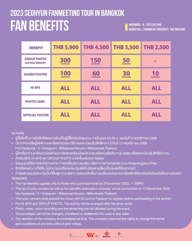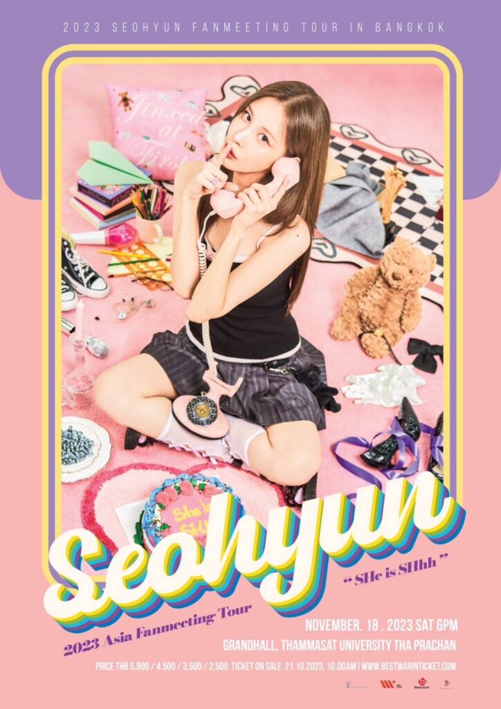 “ซอฮยอน” จะกลับมาพบเหล่าโซวอนไทยอีกครั้ง  และ เตรียมขนโชว์มาแบบจัดเต็ม  รับรองว่าโซวอนไทยต้องฟินกันถ้วนหน้าอย่างแน่นอน  เตรียมเคลียร์คิวให้พร้อมเพื่อมาเจอ “ซอฮยอน ” พร้อมทั้งมาสร้างความประทับใจไปด้วยกัน ปักหมุดรอได้เลยสำหรับงาน 2023 SeoHyun Fanmeeting in Bangkok < SHe is SHhh>ที่จัดขึ้นในวันเสาร์ที่ 18 พฤศจิกายน 2566 ณ หอประชุมใหญ่ มหาวิทยาลัยธรรมศาสตร์ ท่าพระจันทร์ เปิดจำหน่ายบัตรในวันเสาร์ที่ 21 ตุลาคม 2566 เวลา 10.00 น. ทาง https://www.bestwarinticket.com/ ราคาบัตร 5,900 / 4,500 / 3,500 / 2,500 บาท และสิทธิ์พิเศษสำหรับโซวอนไทย ได้ HI-BYE ทุกที่นั่ง
