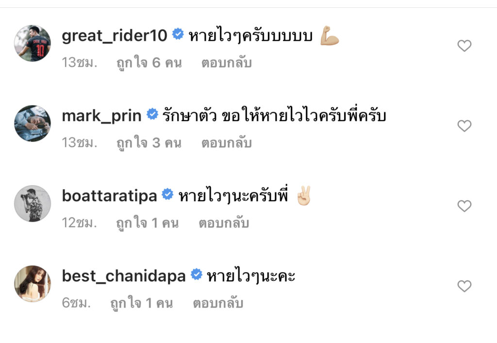 ทั้งนี้ก็แฟนคลับและเพื่อนดาราต่างเข้ามาส่งกำลังใจให้เจ้าตัวหายไวๆ อาทิ เกรท วรินทร เมนต์ว่า หายไวๆครับบบส่วนหนุ่ม หมาก ปริญ บอกว่า รักษาตัว ขอให้หายไวไวครับพี่ครับ