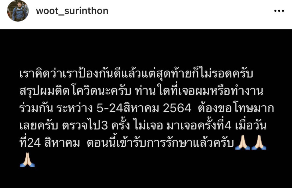 ซึ่งงานนี้เจ้าตัวได้ออกมาโพสต์ข้อความว่า“เราคิดว่าเราป้องกันดีแล้ว แต่สุดท้ายก็ไม่รอดครับ สรุปผมติดโควิดนะครับ ท่านใดที่เจอผมหรือทำงานร่วมกัน ระหว่าง 5-24 สิงหาคม 2564 ต้องขอโทษมากเลยครับ ตรวจไป 3 ครั้ง ไม่เจอ มาเจอครั้งที่ 4 เมื่อวันที่ 24 สิงหาคม ตอนนี้เข้ารับการรักษาแล้วครับ“