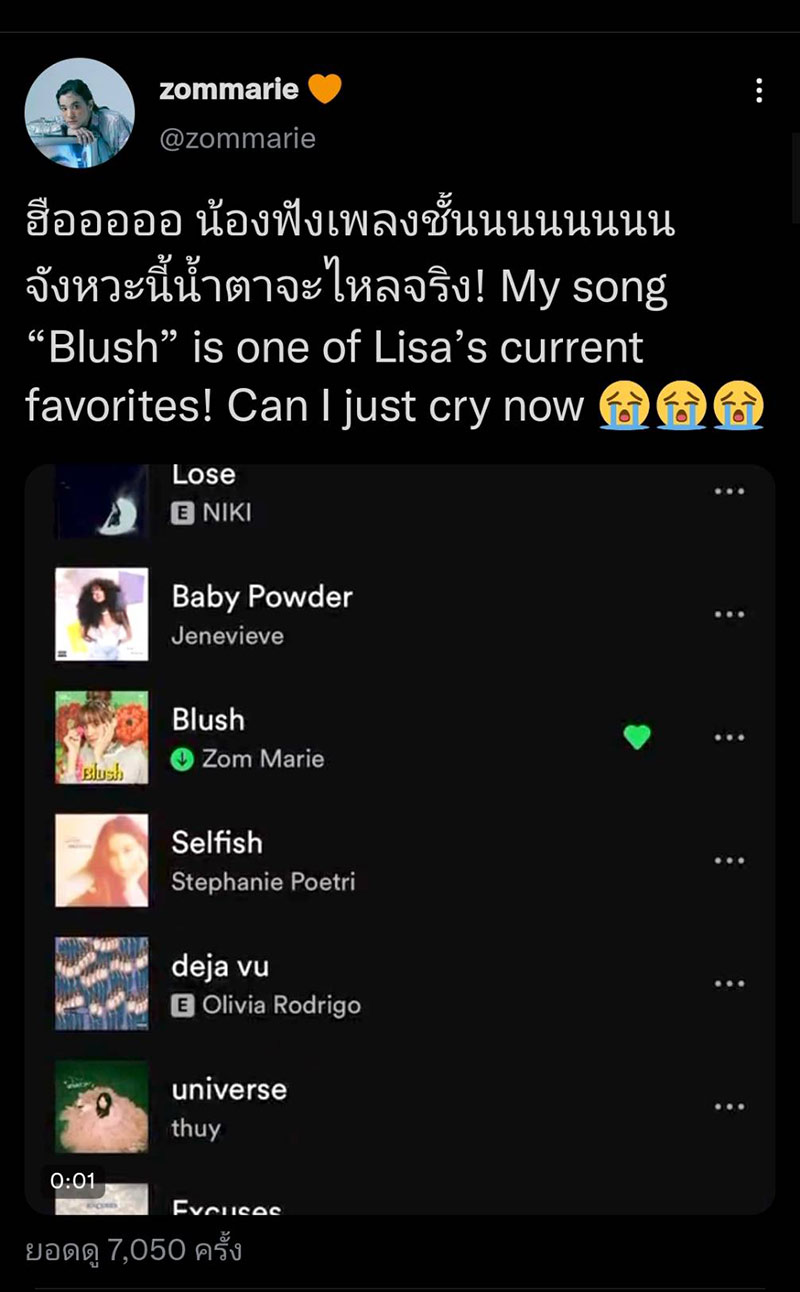 ส้ม มารี สุดปลื้ม ลิซ่า เลือกเพลง Blush เป็นหนึ่งในเพลย์ลิสต์โปรด