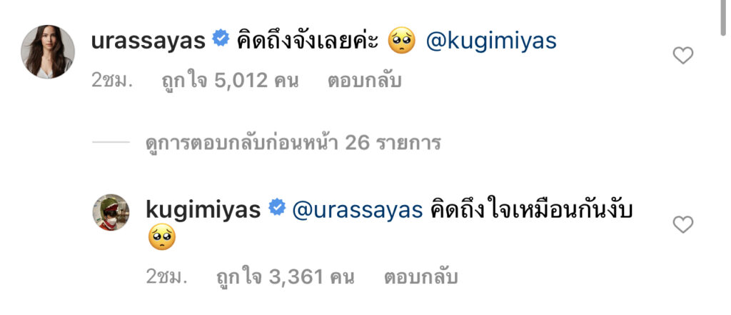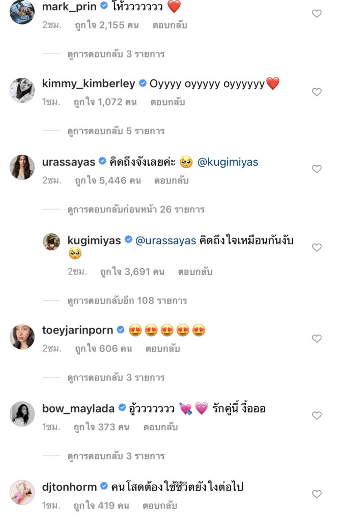 งานนี้ทำเอาไอจีอบอวลไปด้วยความรัก โดยณเดชน์ได้โพสต์รูปคู่หวานหน้าแนบชิดสาว ญาญ่า พร้อมแคปชั่นอิโมจิรูปหัวใจสีชมพู่แต่ที่เอาทำเอาฆ่าคนโสดตายไม่ฟื้นก็คงจะเป็นคอมเมนต์ที่สาวญาญ่าเมนต์ว่าคิดถึงจังเลยค่ะโดยหนุ่มณเดชน์เข้ามาสาดความหวานกลับด้วยคิดถึงใจเหมือนกันครับโอ้ยงานนี้ทำเอาชาวเน็ตถึงขั้นออกอาการฟินในความน่ารักและเหม็นความรักของทั้งคู่กันกระหน่ำไอจี ซึ่งก็มีเหล่าบรรดาเพื่อนดาราแห่เข้ามากดไลค์พร้อมคอมเมนต์แซวอาทิหมาก ปริญ เมนต์ว่าโห้วววว❤️ต่อมาสาว โบว เมลดา บอกว่าอู้ววว รักคู่นี้ งื้อออ ส่วนสาว ต้นหอมแซวว่าคนโสดต้องใช้ชีวิตต่อไปยังไง และอีกมากมายเลยจ้า