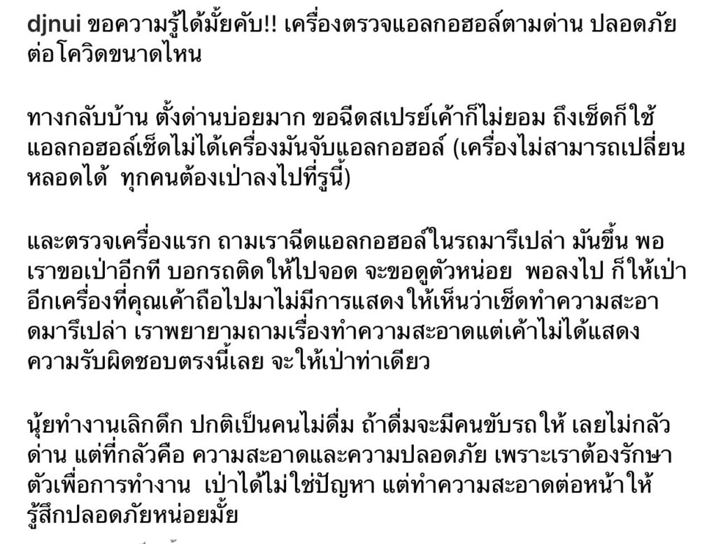 นุ้ยทำงานเลิกดึก ปกติเป็นคนไม่ดื่ม ถ้าดื่มจะมีคนขับรถให้ เลยไม่กลัวด่าน แต่ที่กลัวคือ ความสะอาดและความปลอดภัย เพราะเราต้องรักษาตัวเพื่อการทำงาน เป่าได้ไม่ใช่ปัญหา แต่ทำความสะอาดต่อหน้าให้รู้สึกปลอดภัยหน่อยมั้ย”