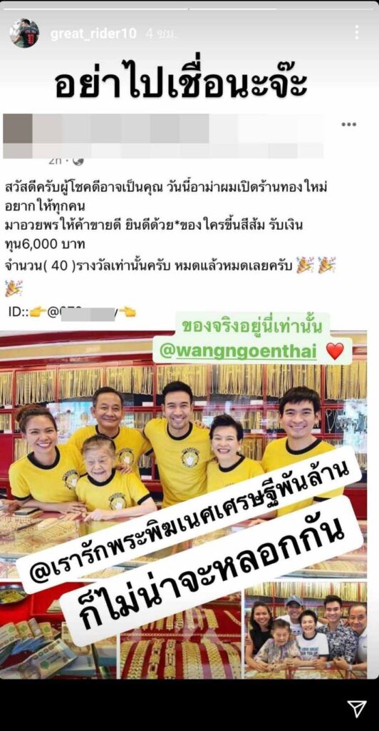 เรียกว่ามีเรื่องให้ปวดหัวอยู่ตลอดสำหรับพระเอกหมาดเข้ม เกรท วรินทร หลังโดนมิจฉาชีพนำรูปร้านทองของครอบครัวไปแอบอ้างในเฟซบุ๊กเพื่อหารายได้ งานนี้หนุ่มเกรทจึงรีบออกโรงมาเคลียร์โพสต์รูปดังกล่าวลงในไอจีสตอรี่พร้อมเขียนว่าอย่าไปเชื่อนะจ๊ะ