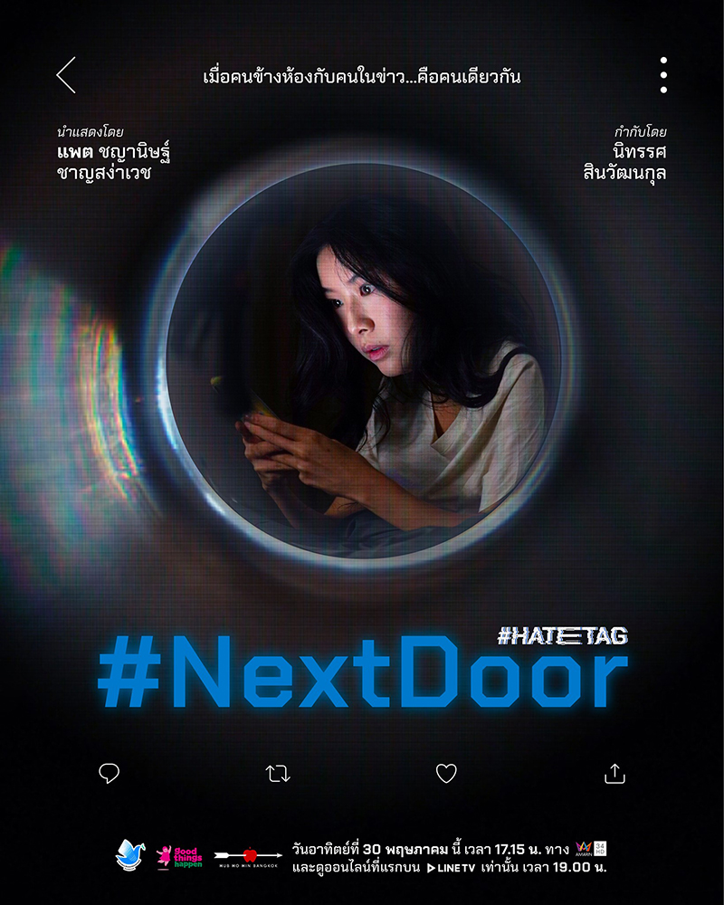ชวนทุกคนมาลุ้นไปกับหนังสั้น โปรเจกต์ #HATETAG เรื่อง #NextDoor กำกับโดย บอม–นิทรรศ สินวัฒนกุล โดยเป็นเรื่องราวความฝันที่จะมีชีวิตที่ดีของ เอ็มมี่ (แพต-ชญานิษฐ์ ชาญสง่าเวช) กลับพังทลายลง เมื่อคอนโดที่ เอ็มมี่ เพิ่งซื้อมีเพื่อนบ้านเป็นฆาตรกรที่เคยเห็นในข่าวดัง เอ็มมี่ จึงพยายามหาหลักฐานมายืนยันกับโลกโซเชียลว่าเธอไม่ได้คิดไปเอง
