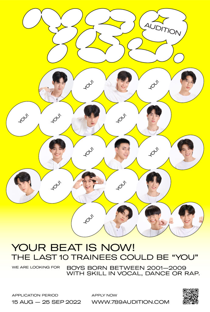 789 AUDITION (เจ็ด-แปด-เก้า-ออ-ดิ-ชัน) เปิดรับสมัคร ONLINE AUDITION ตั้งแต่วันนี้ ถึง 25 ก.ย. 65 ซึ่งคุณสมบัติของผู้สมัคร มีดังนี้ เป็นเพศชาย อายุ 13-21 ปี เกิดระหว่างปี พ.ศ. 2544-2552 (ค.ศ. 2001-2009) ไม่จำกัดสัญชาติ มีความสามารถในด้านการร้อง การเต้น หรือการแรป ผู้สนใจสามารถกรอกใบสมัครผ่านเว็บไซต์ WWW.789AUDITION.COM โดยไม่เสียค่าใช้จ่ายใดๆ ทั้งสิ้น ซึ่งไฟล์ที่ผู้สมัครต้องแนบส่ง มีดังนี้