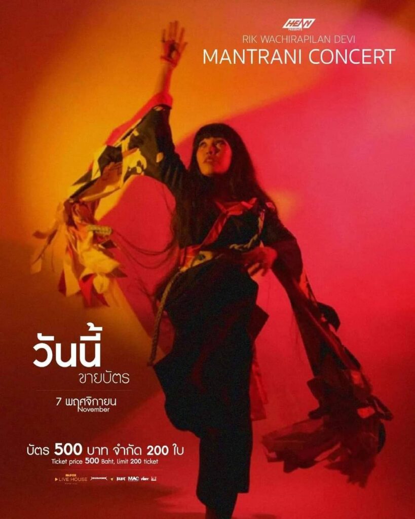 เฮฟวี่ ออร์แกไนเซอร์ ขอเชิญชวนรับชมคนเสิร์ตเพื่อการแสวงหาแรงบันดาลใจ “HEAVY Presents MANTRANI CONCERT” Vol. 01 Red Lotus By Rik Wachirapilan Devi (ริค วชิรปิลันธิ์) ศิลปินสาวที่มีความเป็นตัวเองสูงอย่างชัดเจน กับแนวดนตรีภาวนา ผสมผสาน ดนตรีอิเล็กทรอกนิกส์ ที่เหมาะสำหรับคนที่กำลังแสวงหาแรงบันดาลใจเป็นอย่างที่สุด ร่วมด้วยศิลปินร่วมบรรเลงสังคีตภาวนา ในนาม วงวัชรจักรฺ โดยมีสมาชิกคนอื่น ๆ คือ วรรณฤทธิ์ พงศ์ประยูร จากวง Stylish Nonsense ในตำแหน่ง Synthesizer , ธนเดช เจริญเสียง ในตำแหน่ง Guitar , ญาณิกา เลิศพิมลชัย จากวง YAAN ในตำแหน่ง Percussions ในวันเสาร์ที่ 10 ธ.ค 65 เวลา : 20.00 น. ณ Mr.Fox : Town In Town (ติด The Scene) จำหน่ายบัตรในราคา 500 บาท ! มีเพียง 200 ใบเท่านั้น ! ใบละ500บาท สนใจซื้อบัตรเพื่อร่วมหาแรงบันดาลใจกันได้ที่ www.heavyorganizer.com/mantrani