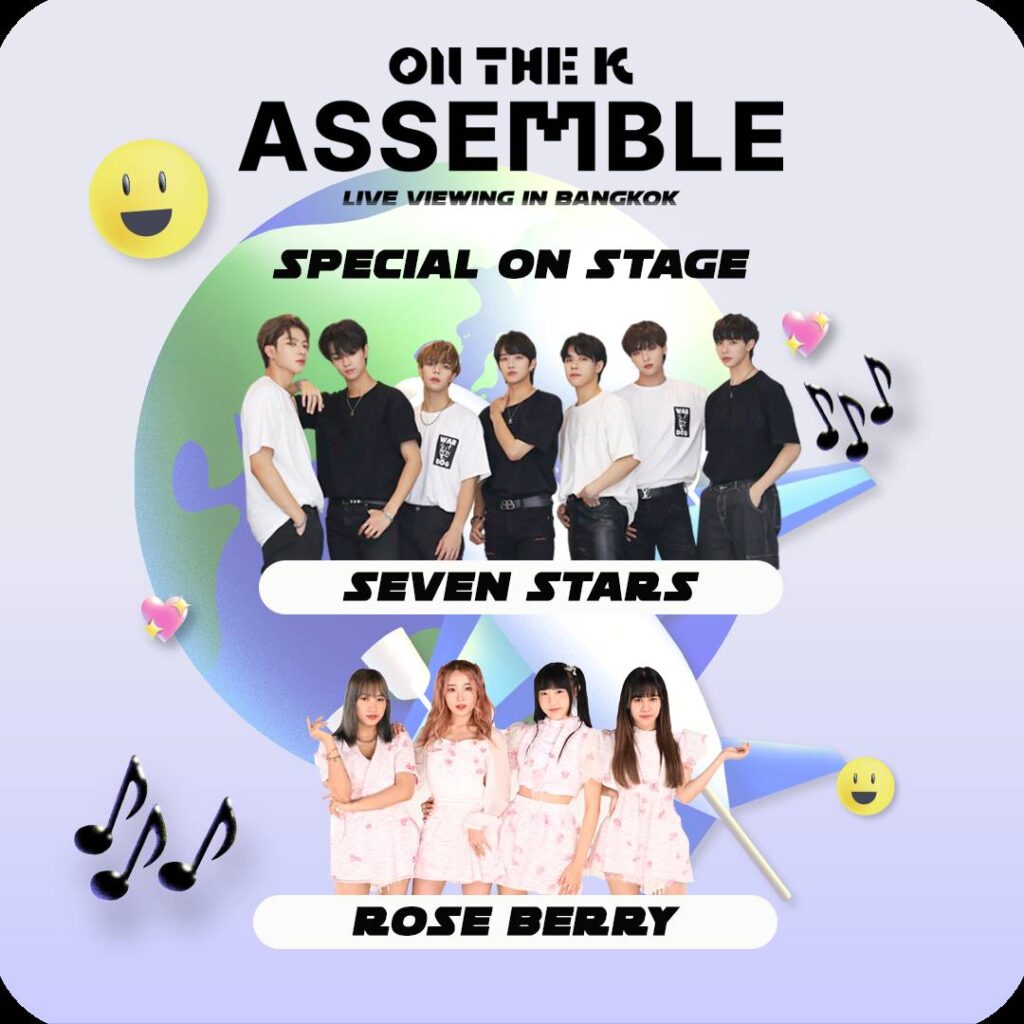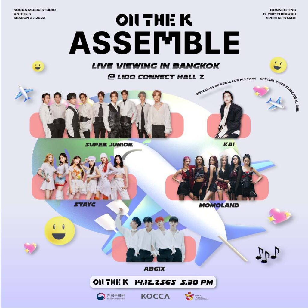 KOCCA Thailand (KOCCA Thailand Business Center), KCC Thailand (ศูนย์วัฒนธรรมเกาหลีแห่งประเทศไทย) และ KTO Thailand (องค์การส่งเสริมการท่องเที่ยวประเทศเกาหลี) ร่วมเป็นเจ้าภาพจัดงาน “<ON THE K: Assemble> Live Viewing in Bangkok” การแสดงคอนเสิร์ต K-POP ออนไลน์สุดล้ำปรียบเสมือน AR ที่จะทำให้คุณได้สัมผัสประสบการณ์ คอนเสิร์ตเสมือนจริง จัดเต็มทั้งแสง สี เสียง และเอฟเฟค! และยังมีกิจกรรม Sing along รวมถึงอุปกรณ์เชียร์ที่จะให้แฟนๆ ได้ร่วมสนุก และเชียร์เป็นกำลังใจเพื่อสร้างบรรยากาศราวกับอยู่ในสถานที่แสดงคอนเสิร์ตจริง ได้ศิลปินตัวแทนของ K-POP 5 กรุ๊ป อย่าง Super Junior, KAI (EXO), Momoland , AB6iX, และ STAY C นอกจากนี้ยังมีวิดีโอสัมภาษณ์พิเศษจาก AB6IX อีกด้วย นับเป็นโอกาสดีที่จะได้สัมผัสการแสดงในรูปแบบใหม่อย่างที่ไม่เคยมีมาก่อน และยังมีหนุ่ม 7 หนุ่ม ‘SEVEN STARS’ บอยแบนด์ลูกผสมไทย – เกาหลี จากรายการ Seven Stars ที่ออนแอร์ผ่านทางช่อง 3 และเกิร์ลกรุ๊ป 4 สาว Roseberry จากโครงการ 2022 Grow Twogether ที่จะมาร่วมสร้างบรรยากาศทำการแสดงพิเศษในรูปแบบออฟไลน์ในงานอีกด้วย