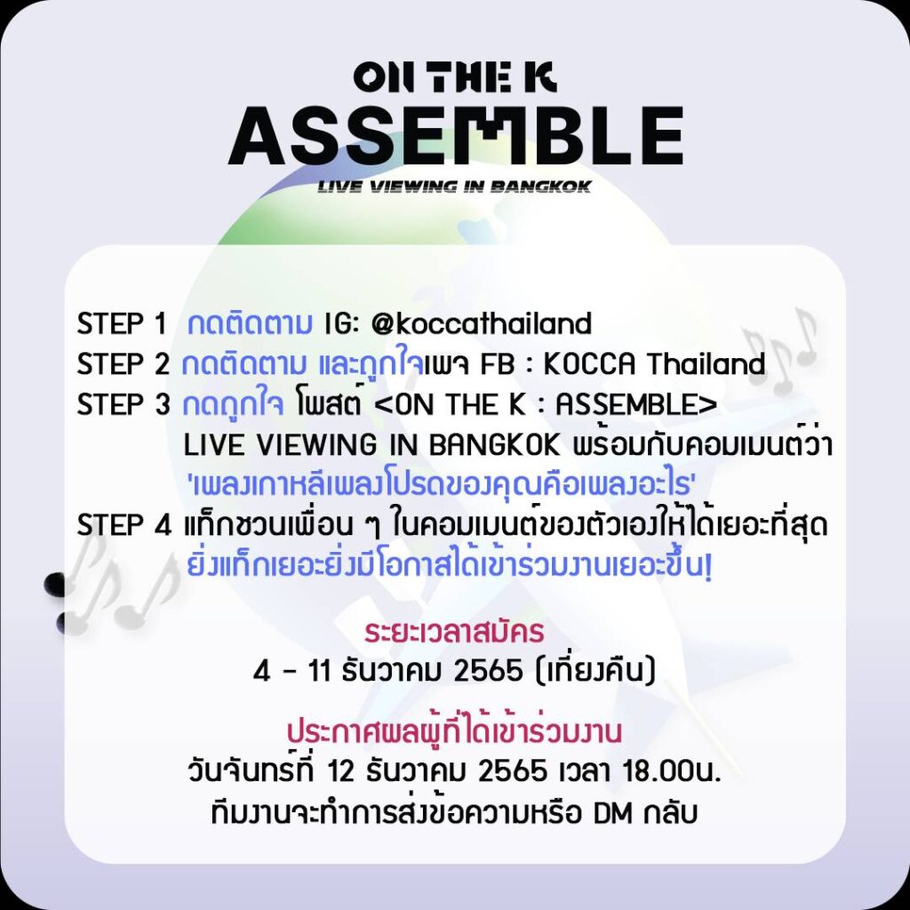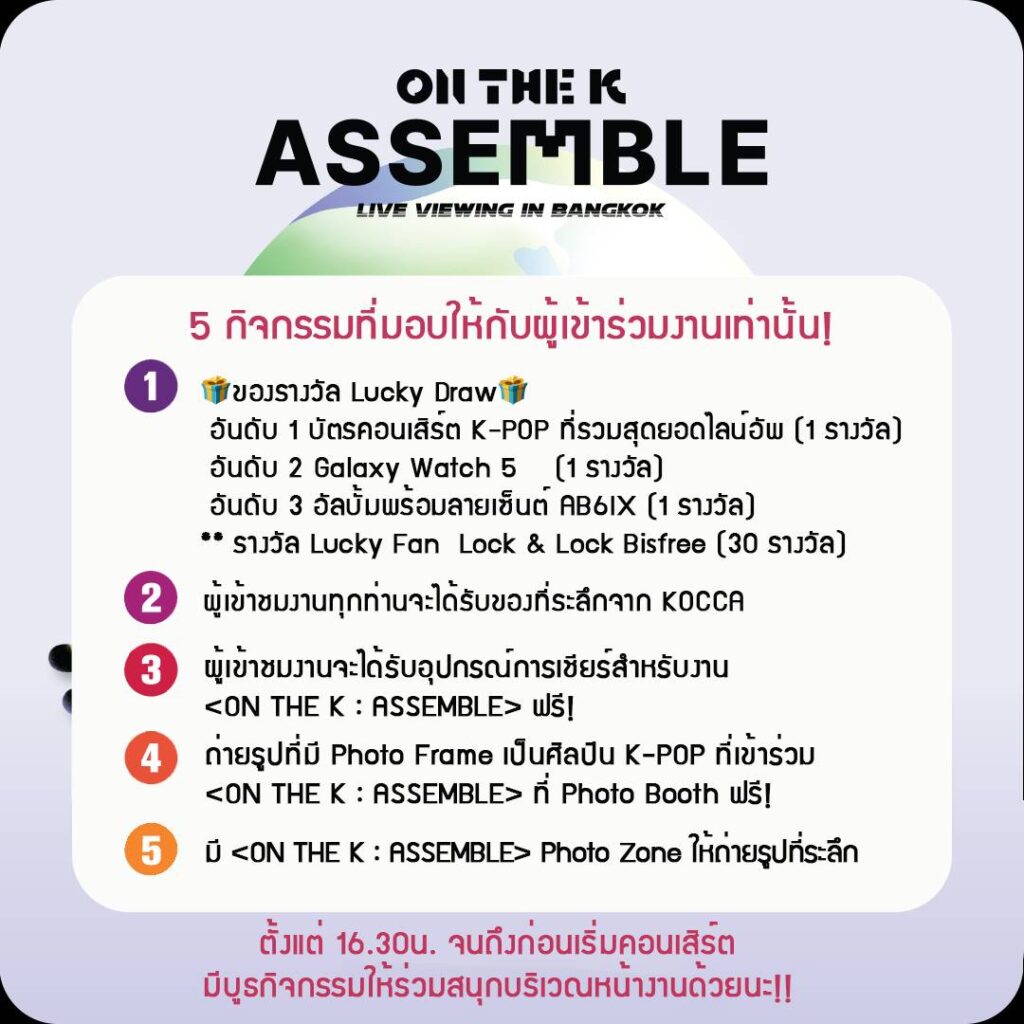 แฟนๆ ที่รัก K-POP และ T-POP ทุกคนอย่าพลาด “ON THE K: Assemble Live Viewing Bangkok” จะจัดขึ้นที่กรุงเทพฯ ประเทศไทยในวันที่ 14 เดือน ธันวาคม พ.ศ. 2565 เวลา 17.30 น. ที่ ลิโด้ คอนเนค ฮอลล์ 2 โดย .. ชมเทปบันทึกภาพการแสดงในครั้งนี้ฟรี !! การเข้าร่วมชมคอนเสิร์ตจะได้รับแท่งไฟเชียร์ และของที่ระลึกจาก KOCCA ฟรี กิจกรรมโฟโต้บูธถ่ายรูปกับเฟรมภาพศิลปินให้ได้ร่วมสนุกกัน และยังมีกิจกรรมสุ่มผู้โชคดีเพื่อลุ้นรับของรางวัล Lucky Draw อีกมากมาย และ มาพบกับคอนเสิร์ตในรูปแบบใหม่ไปพร้อมกัน !!