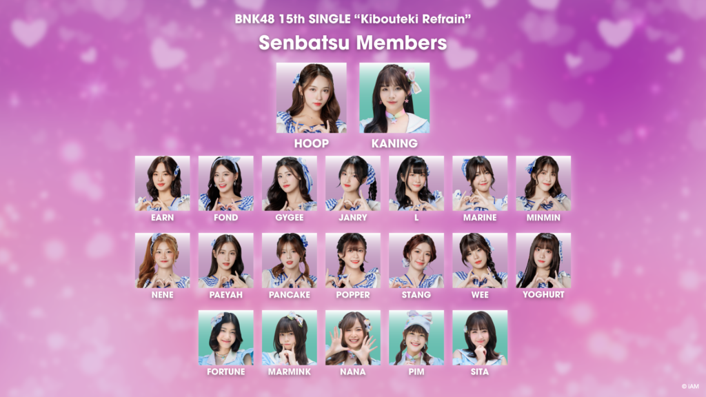 ตามด้วยซิงเกิลที่ 15 “Kibouteki Refrain” เร็วๆ นี้ ซึ่งได้ประกาศจำนวนเซ็มบัตสึมากที่สุดถึง 21 คน ได้แก่ เอิร์น, ฟ้อนด์, จีจี้, ฮูพ, แจนรี่, แอล, มารีน, มินมิน, เนเน่, ปาเอญ่า, แพนเค้ก, ป๊อปเป้อ, สตางค์, วี, โยเกิร์ต จาก BNK48 และ ฟอร์จูน, คนิ้ง, มามิ้ง, พิม, สิตา, นานา จาก CGM48 โดยมี ฮูพ-ปาฏลี ประเสริฐธีระชัย (BNK48) กับ คนิ้ง-วิทิตา สระศรีสม (CGM48) รับหน้าที่ Double Center