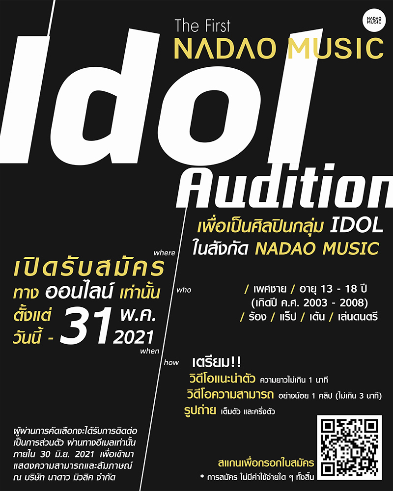เป็นอีกโปรเจกต์ที่ไม่อยากให้พลาด!! เมื่อค่าย นาดาว มิวสิค เปิดโครงการ “The First Nadao Music Idol Audition” โดยเปิดรับสมัครออดิชั่น ค้นหาศิลปิน IDOL ชาย เพื่อเป็นศิลปินในสังกัด นาดาว มิวสิค โดยผู้ที่สนใจสามารถกรอกใบสมัครออนไลน์ ซึ่งไฟล์ที่ต้องแนบส่ง ได้แก่ คลิปวิดีโอแนะนำตัว ความยาวไม่เกิน 1 นาที พร้อมด้วยคลิปวิดีโอความสามารถ อย่างน้อย 1 คลิป ความยาวไม่เกินคลิปละ 3 นาที และรูปถ่ายแบบเต็มตัวและครึ่งตัว เปิดรับสมัครตั้งแต่ วันนี้ – 31 พฤษภาคมนี้ โดยไม่เสียค่าใช้จ่ายใด ๆ ทั้งสิ้น ซึ่งผู้ผ่านการคัดเลือกจะได้รับการติดต่อเป็นการส่วนตัวผ่านทางอีเมลเท่านั้น (ภายในวันที่ 30 มิถุนายนนี้) เพื่อเข้ามาแสดงความสามารถและสัมภาษณ์ ณ บริษัท นาดาว มิวสิค จำกัด