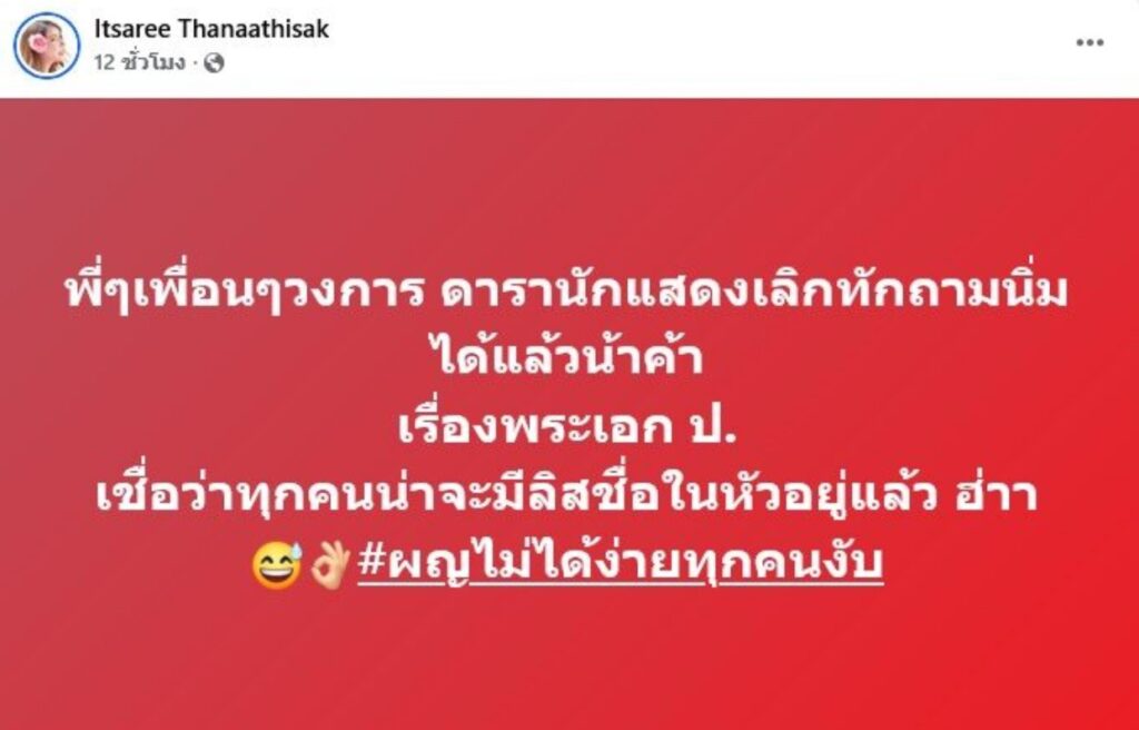 “พี่ๆเพื่อนๆวงการ ดารานักแสดงเลิกทักถามนิ่มได้แล้วน้าค้า เรื่องพระเอก ป.เชื่อว่าทุกคนน่าจะมีลิสต์ชื่อในหัวอยู่แล้ว ฮ่าา #ผญไม่ได้ง่ายทุกคนงับ” ซึ่งหวยจะไปตกที่ใครคงต้องรอติดตามกันตอนต่อไป