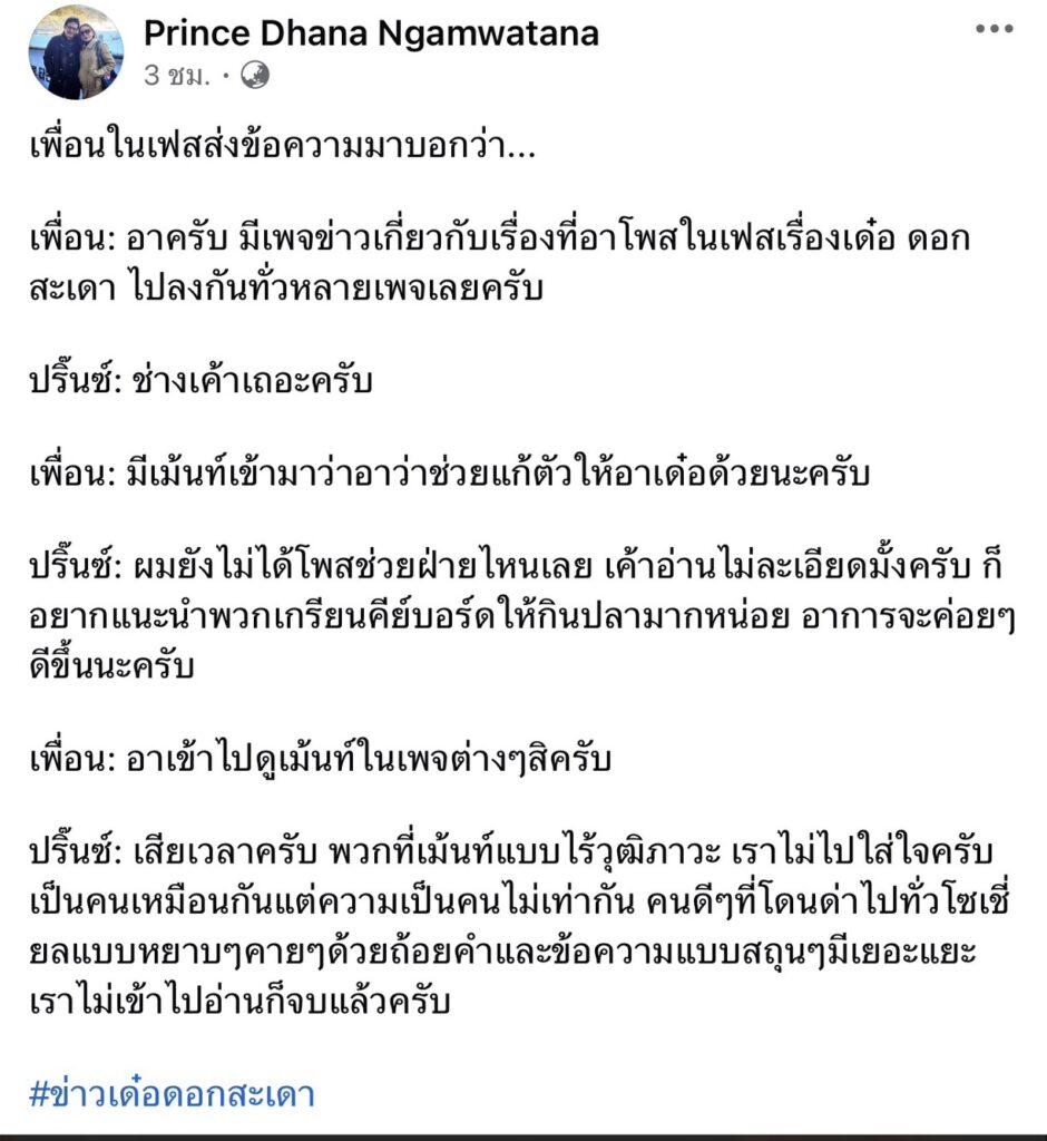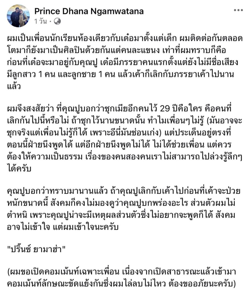 ขณะเดียวกันทางด้าน “ปริ๊นซ์ ยามาฮ่า” เพื่อนสนิท “เด๋อ” ได้ออกมาโพสต์ภาพ พร้อมข้อความว่า “ผมเป็นเพื่อนนักเรียนห้องเดียวกับเด๋อมาตั้งแต่เด็ก ผมติดต่อกันตลอด โตมาก็ยังมาเป็นศิลปินด้วยกันแต่คนละแขนง เท่าที่ผมทราบก็คือ ก่อนที่เด๋อจะมาอยู่กับคุณปู เด๋อมีภรรยาคนแรกตั้งแต่ยังไม่มีชื่อเสียง มีลูกสาว 1 คน และลูกชาย 1 คน แล้วเค้าก็เลิกกับภรรยาเค้าไปนานแล้ว