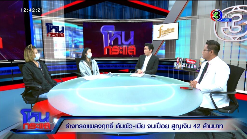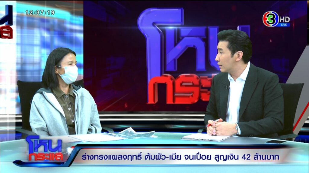 ณ วันนี้คุณเสียเงินไป 40 กว่าล้าน รวมทรัพย์สินอื่นๆ อีก 50 ล้าน ร่างทรงบอกให้ตัวร่างยืมเงิน 3 แสน มีอุบายต่างๆ นานา ให้ปล่อยเงินกู้ให้ชาวนา 3 ล้าน ผู้เสียหายเอาเงินไปให้ร่างทรง แล้วร่างทรงเอาไปทำสัญญากับชาวนา แล้วก็เเอาเงินเราไปฝากขายที่ดิน เป็นเงินของพี่ ซึ่งไม่รู้จริงหรือเปล่าแค่พาไปดูที่แปลงนี้ๆ? สา : “แล้วก็เอาเงินเราไปลงเครื่องจักร เครื่องรีดหลังคา เราให้เขาทำแทนเรา เปิดบริษัทด้วย เพราะเราเป็นบริษัทผลิตหลังคา ก็ให้เขาทำแทนตรงนี้ ในนามบริษัท แต่ไม่ใช่ชื่อเรา เราเป็นนายทุน เขาบอกว่าเอาไว้เวลาประมูลงาน ถ้ามีชื่อผู้บริหารสองที่จะประมูลไม่ได้” เขาใช้เป็นช่องโหว่? สา : “ค่ะ แต่เขาบอกจะทำสัญญาให้เรา 50 เปอร์เซ็นต์พอมีรายได้ทุกอย่าง แต่ยังไม่ได้ทำ เพราะเรารู้เรื่องก่อน” กรณีแบบนี้จะเอาเงินคืนได้เหรอ? ทนาย : “ต้องไล่ดูก่อนว่าพฤติกรรมที่เราหลงเชื่อ หลงเชื่อจากอะไร ความเชื่อตัวไหน เขารู้จักกันมาปี 58 แล้ว และมีหลายก้อน ต้องบอกก่อนว่าทางกฎหมายค่อนข้างเหนื่อยหน่อย” กี่เปอร์เซ็นต์ที่จะได้คืน? ทนาย : “ผมว่าก็ต้องได้ ตั้ง 40 กว่าล้าน ต้องเหลือบ้างแหละ ก็ยังไม่ได้ติดต่อเขาเลย”