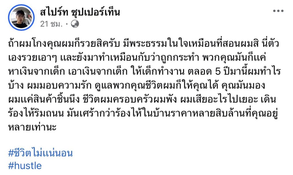 โดยโพสต์ข้อความว่า ”ถ้าผมโกงคุณผมก็รวยสิครับ มีพระธรรมในใจเหมือนที่สอนผมสิ นี่ตัวเองรวยเอาๆ เเละยังมาทำเหมือนกับว่าถูกกระทำ พวกคุณมันก็เเค่หาเงินจากเด็ก เอาเงินจากเด็ก ให้เด็กทำงาน ตลอด 5 ปีมานี้ผมทำไรบ้าง ผมมอบความรัก ดูแลพวกคุณชีวิตผมก็ให้คุณได้ คุณมันมองผมเเค่สินค้าชิ้นนึง ชีวิตผมครอบครัวผมพัง ผมเสียอะไรไปเยอะ เดินร้องไห้ริมถนน มันเศร้ากว่าร้องไห้ในบ้านราคาหลายสิบล้านที่คุณอยู่ หลายเท่านะ #ชีวิตไม่เเน่นอน #hustle“