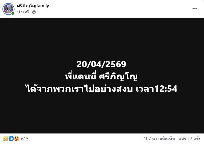 เฟซบุ๊ก ศรีภิญโญfamily โพสต์ข้อความว่า “20/04/2569 พี่แดนนี่ ศรีภิญโญ ได้จากพวกเราไปอย่างสงบ เวลา12:54” ท่ามกลางแฟนๆต่างเข้ามาคอมเมนต์อาลัยแสดงความเสียใจและส่งกำลังใจให้อย่างล้นหลาม