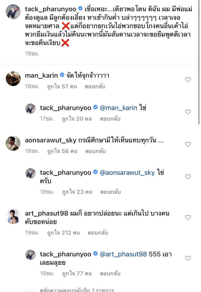 ซึ่งงานนี้ก็มีแฟนคลับเพื่อนดาราต่างเข้ามาแสดงความคิดเห็นให้หนุ่มแทคจัดการขั้นเด็ดขาดเลย อาทิ แมน การินบอกว่า..จัดให้จุก ส่วน อาร์ต พศุตม์..ผมก็อยากปล่อยนะ แต่เกินไปบางคนคับขอหน่อย ด้าน อ้น สราวุธ เมนต์ว่า..กรณีศึกษามีให้เห็นแทบทุกวัน