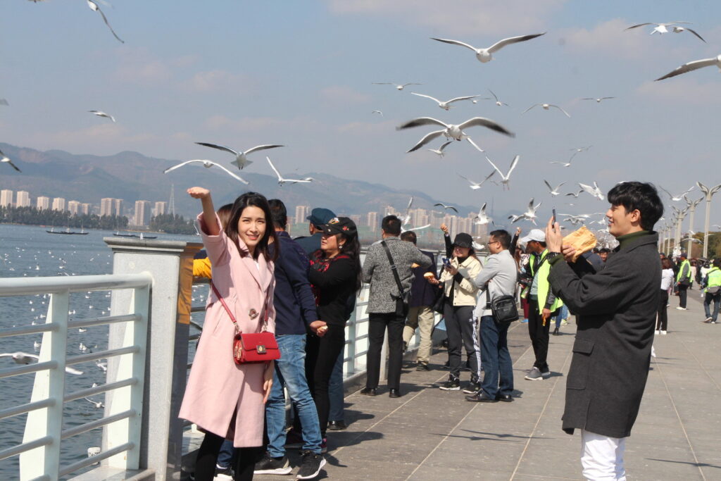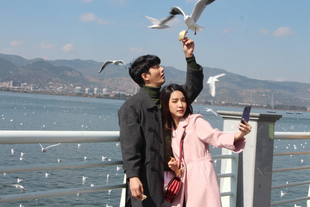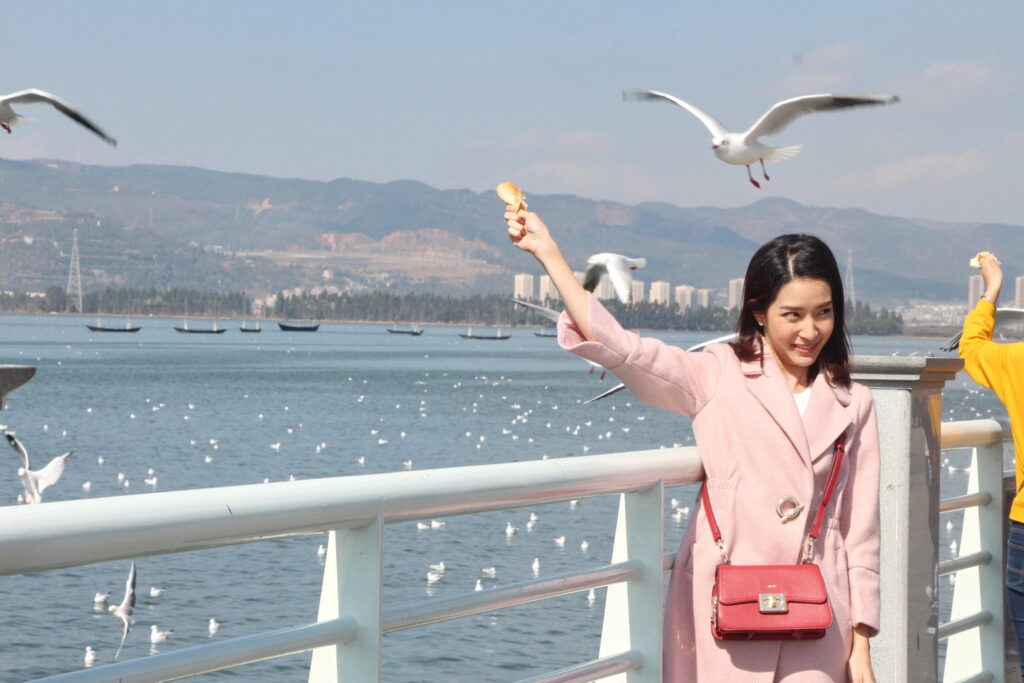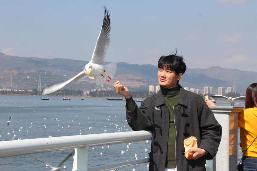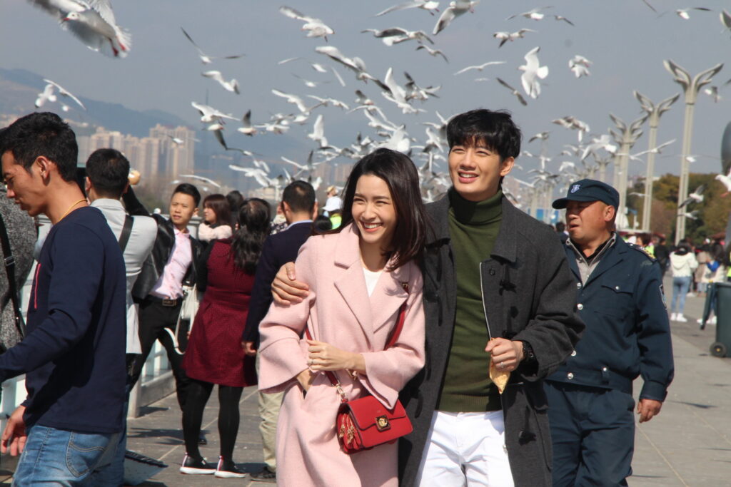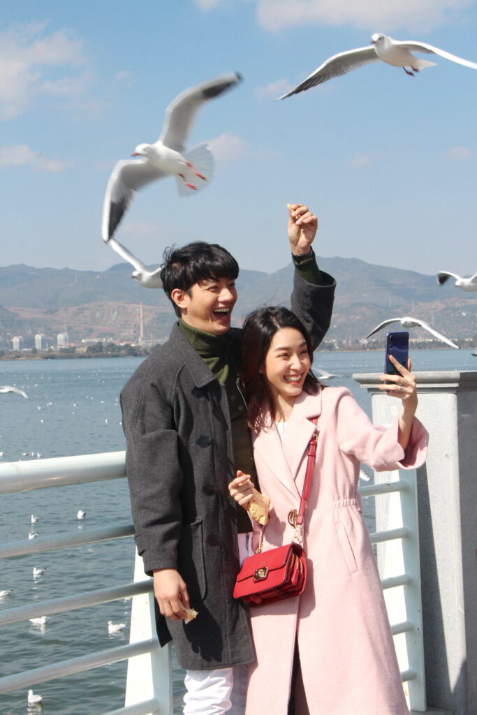 โดยฉากนี้จะเป็นซีนน่ารัก หว๊าน…หวาน… กุ๊กกิ๊กสุดๆ ของ “ภณ” (เป้ อารักษ์) และ “พิม” (โม มนชนก) ที่หลังแต่งงานทั้งคู่ก็พากันไปฮันนีมูนที่ต่างประเทศ ซึ่งฉากนี้ถ่ายทำกันที่ ทะเลสาบเตียนฉือ อากาศเย็นสบาย มีนกนางนวลปากแดง หนีหนาวมาจากไซบีเรีย บินไปมาเข้าซีนท่ามกลางทัศนียภาพที่สวยงาม อีกทั้ง อ๊อด-บัณฑิต ทองดี ผู้กำกับฯ ก็อยากได้ภาพของ “ภณ” กับ “พิม” เดินเที่ยว ให้อาหารนก แล้วก็ถ่ายรูปเล่นแบบสุดสวีท และด้วยความเป็นมืออาชีพของทั้งคู่ แม้รอบข้างจะมีคนจีน และนักท่องเที่ยวอยู่รอบตัว แต่ทั้งคู่ก็แสดงได้สมจริง เสมือนตรงนั้นมีแค่เราสองคน งานนี้อุปสรรคไปอยู่จังหวะภาพของนกที่จะบินไปมามากกว่า กว่าจะได้ภาพสมใจผู้กำกับก็เล่นเอาเหนื่อย แถมในฉากนี้สามโมต้องให้อาหารนกจากในมือ ก็ทำเอาสาวโมบ่นกลัวนกจะจิก แต่พอถึงเวลาถ่ายจริง เจ้านกก็โฉบมาเอาในมือสาวโมไปอย่างสวยงาม รวมถึงช็อตหวาน ที่เป็นภาพเซลฟี่ของทั้งคู่ และซีนปิดท้ายที่ หนุ่มเป้ และ สาวโม จะต้องเดินจับมือคุยกระหนุงกระหนิง แล้วจะต้องจูบ ทั้งคู่ก็แสดงได้อย่างไม่มีทีท่าขวยเขิน แม้จะมีรถวิ่งไปมา แถมต้องถ่ายหลายครั้งมีทั้งภาพมุมกว้างและภาพเจาะ งานนี้บอกได้เลยจะทำให้แฟนๆที่ลุ้นความรักของเพื่อนคู่นี้ได้ฟินจิกหมอนกันแน่