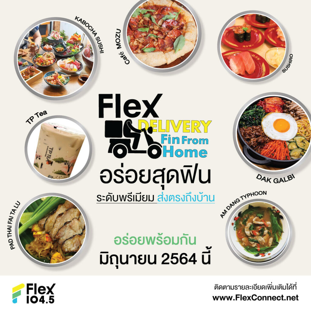 นอกเหนือที่ให้ทุกคนได้ Stay Safe ที่บ้านและฟินไปกับเพลงฮิตตลอด 24 ชั่วโมงแล้ว Flex 104.5 ยังอยากให้ทุกคนได้มาร่วมเปิดประสบการณ์ความฟินแบบ extraordinary กับกิจกรรม Flex Delivery #FinFromHome ที่พร้อมเสริฟมื้อพิเศษจาก 7 ร้านดังระดับพรีเมียม ได้แก่ ร้านผัดไทยไฟทะลุ ผัดไทยมิชลิน 3 ปีซ้อน , ร้าน Kabocha Shushi ที่นำเข้าวัตถุดิบมาจากตลาดปลาโตโยสุแบบวันต่อวัน, ร้าน Sushiro ซูชิสายพานอันดับ 1 ในประเทศญี่ปุ่น ที่ใครๆต้องไปต่อคิวหลายชั่วโมง , ร้านอำแดงไต่ฝุ่น ร้านอาหารไทยตำหรับดังเดิมที่การันตีด้วยมิชลินไกด์ , ร้าน TP Tea ชานมไข่มุกสูตรต้นตำรับแก้วแรกของโลก, ร้าน Dak Galbi กับเมนูสุดฟินเหมือนหลุดออกมาจากซีรีส์เกาหลี และ ร้าน Café Mozu กับเมนูสุดพรีเมี่ยมจากโรงแรมเลอบัว ให้คุณฟินฟรีที่บ้าน เพียงโหลดแอพพลิเคชั่น FlexConnect แล้วลงทะเบียนร่วมกิจกรรม Flex Delivery #FinFromHome ก็รอลุ้นฟินฟรีกับเมนูสุดพรีเมี่ยมก่อนใคร ได้ตั้งแต่มิถุนายนเป็นต้นไป