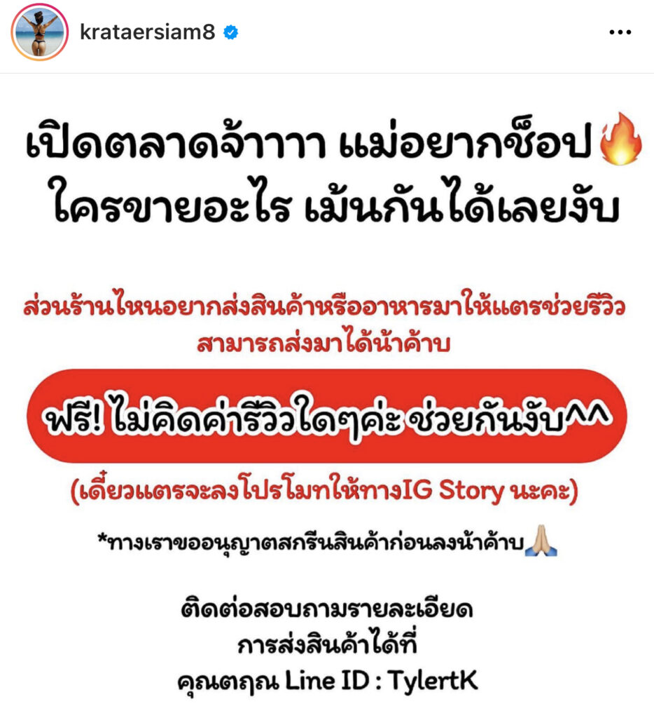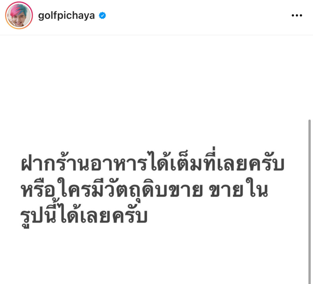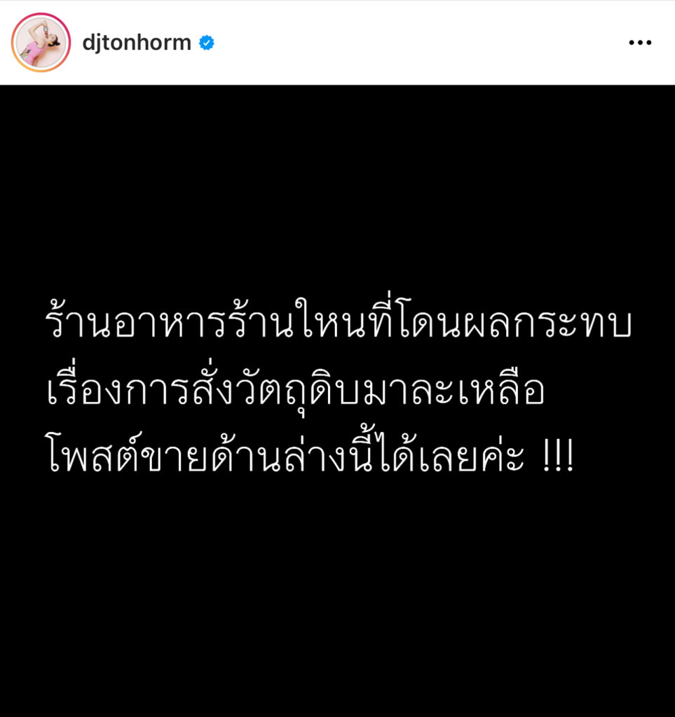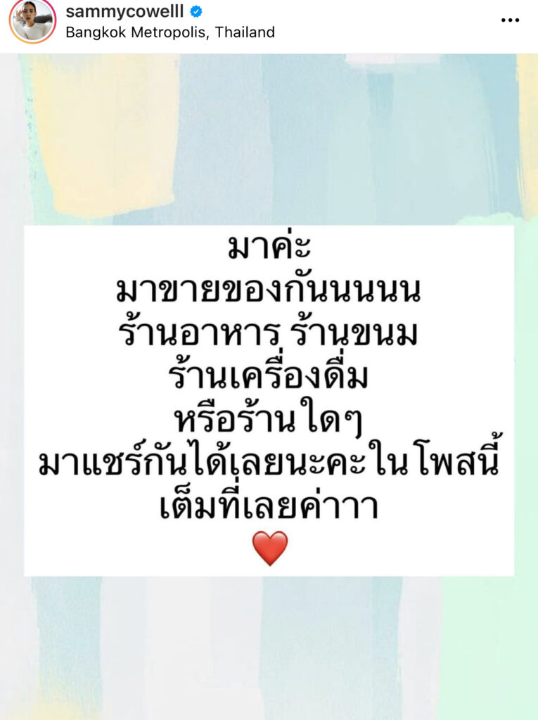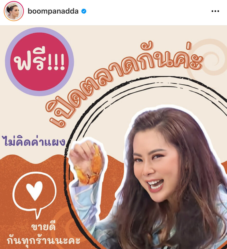 ได้ออกมาโพสต์ผ่านไอจีว่า “มาค่ะ มาขายของกันนนนน ร้านอาหาร ร้านขนม ร้านเครื่องดื่มหรือร้านใดๆ มาแชร์กันได้เลยนะคะ ในโพสต์นี้เต็มที่เลย❤️“