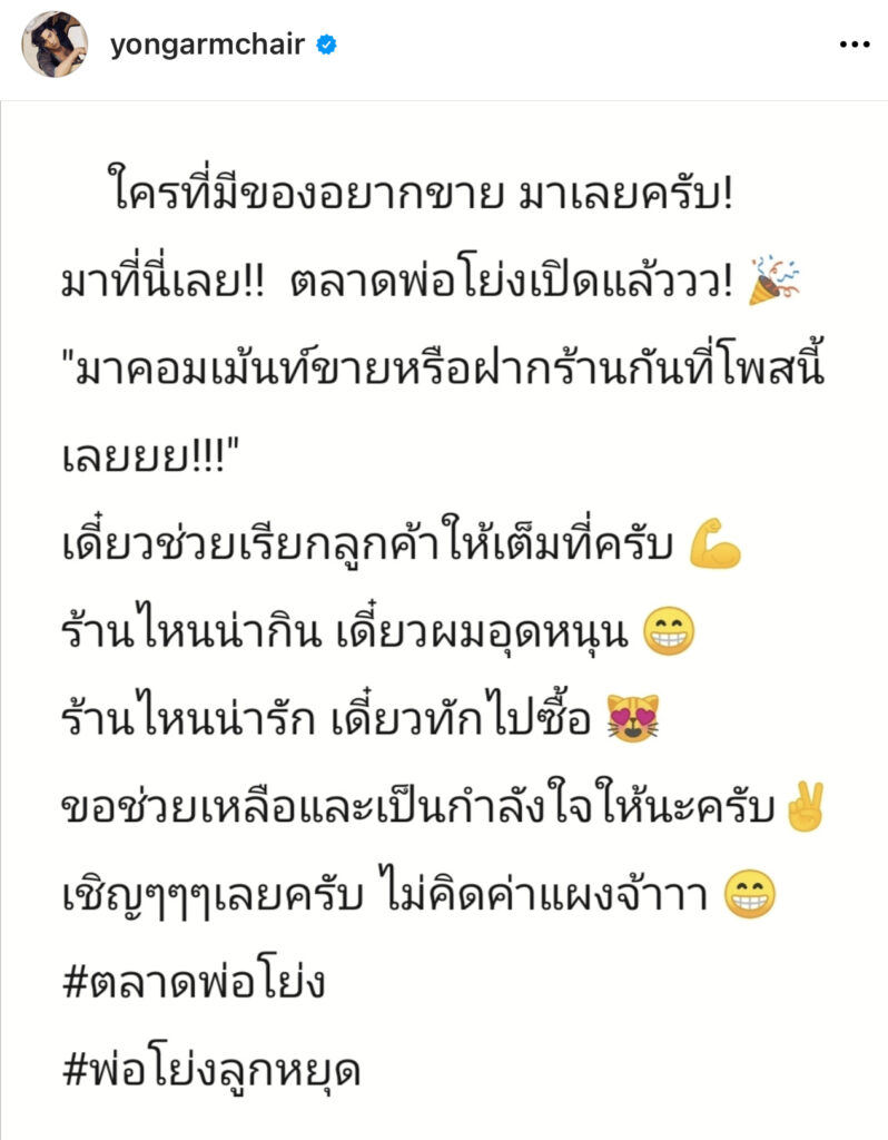 ปิดทางด้วย โย่ง อาร์มแชร์ โพสต์ว่า “ใครที่มีของอยากขายมาเลยครับ! มาที่นี่เลย!!มาคอมเมนต์ขายหรือฝากร้านกันที่โพสนี้ เลยเดี๋ยวช่วยเรียกลูกค้าให้เต็มที่ครับ ร้านไหนน่ากินเดี๋ยวผมอุดหนุน ร้านไหนน่ารักเดี๋ยวทักไปซื้อ ขอช่วยเหลือและเป็นกำลังใจให้นะครับเชิญๆๆๆ เลยครับไม่คิดค่าแผงจ้าาา #ตลาดพ่อโย่ง #พ่อโย่งลูกหยุด“