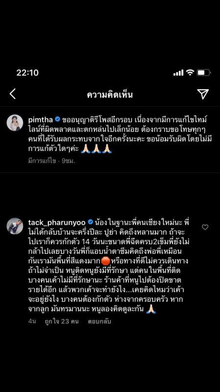 ซึ่งงานนี้ก็มีชาวเน็ตเข้ามาแสดงคอมเมนต์ต่อว่าสาวพิมฐาทำตัวไม่เหมาะสม โดยบางคนก็ให้กำลังใจ