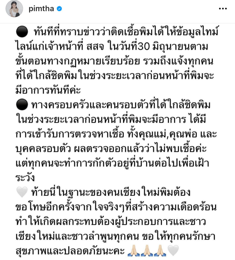 ล่าสุดนักแสดงหนุ่ม “แทค ภรัณยู” ได้ออกมาแสดงความเห็นในไอจีของ “พิมฐา” ตำหนิการกระทำของเธอที่ไม่ระมัดระวังโดยคอมเมนต์ว่า “น้องในฐานะพี่เป็นคนเชียงใหม่พี่ไม่ได้กลับบ้านครึ่งปีละ ปู่ย่าคิดถึงหลานมาก ถ้าเราไปกักตัว14 วัน ขนาดพี่ฉีดครบ2เข็มพี่ยังไม่กล้าไปเลย บางวันพี่แอบน้ำตาซึมคิดถึงพ่อเหมือนกัน เรามันพื้นที่สีแดงมากทางที่ดีไม่ควรเดินทางถ้าไม่จำเป็น หนูติดหนูยังมีที่รักษา แต่บางคนติดไม่มีที่รักษา ร้านค้าที่หนูไป เขาต้องปิดขาดรายได้อีกเขาจะอยู่กันอย่างไร บางคนต้องกักตัว ห่างจากลูก ห่างครอบครัว มันทรมาน