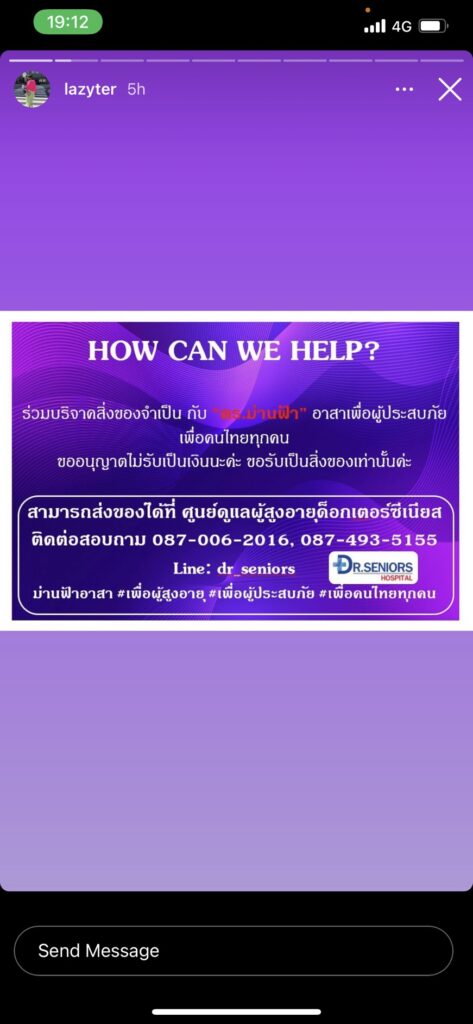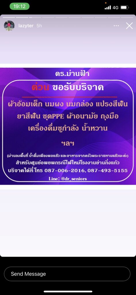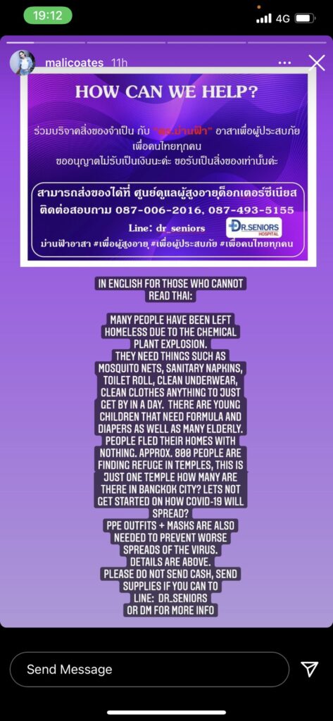 ทั้งนี้เหล่าคนบันเทิงอาทิ อุ้ม ลัขณา,เอ็ม บุษราคัม,เอมี่ กลิ่นประทุม,แหม่ม วิชุดา,ตอง ภัครมัย,น็อต วรฤทธิ์,เก๋ ชลดา,ไอซ์ ณพัชรินทร์ ฯลฯ ยังร่วมมือร่วมใจโพสต์อินสตาแกรมส่วนตัวเพื่อบอกบุญแก่ผู้ที่อยากร่วมช่วยเหลือในการบริจาคผ้าอ้อมเด็ก นมผง นมกล่อง แปรงสีฟัน ยาสีฟัน ชุดPPE ถุงมือ ฯลฯ สำหรับศูนย์อพยพเหตุการณ์ไฟไหม้โรงงานย่านกิ่งแก้วอีกด้วย