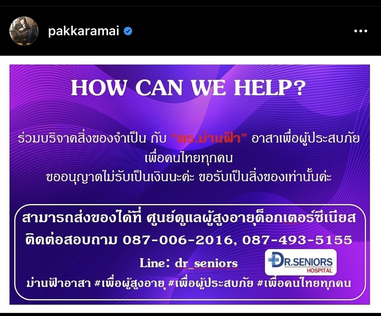 ซึ่งจากเหตุการณ์ดังกล่าว ”ดร.ม่านฟ้า จันทรสาขา” เจ้าของฉายา “นางฟ้าผู้สูงอายุ” ได้รีบเดินทางไปให้ความช่วยเหลือพี่น้องประชาชนอย่างรวดเร็วตั้งแต่เมื่อวานที่ผ่านมาเวลา 20.00 น. เพื่อมอบอาหาร ขนม น้ำดื่มและสิ่งของจำเป็นเพื่อบรรเทาความเดือดร้อนและสร้างขวัญกำลังใจให้ผู้ประสบภัย