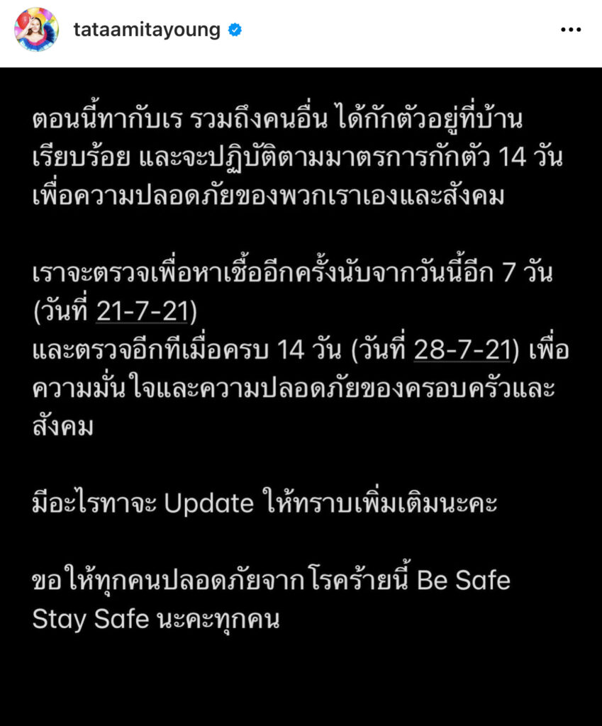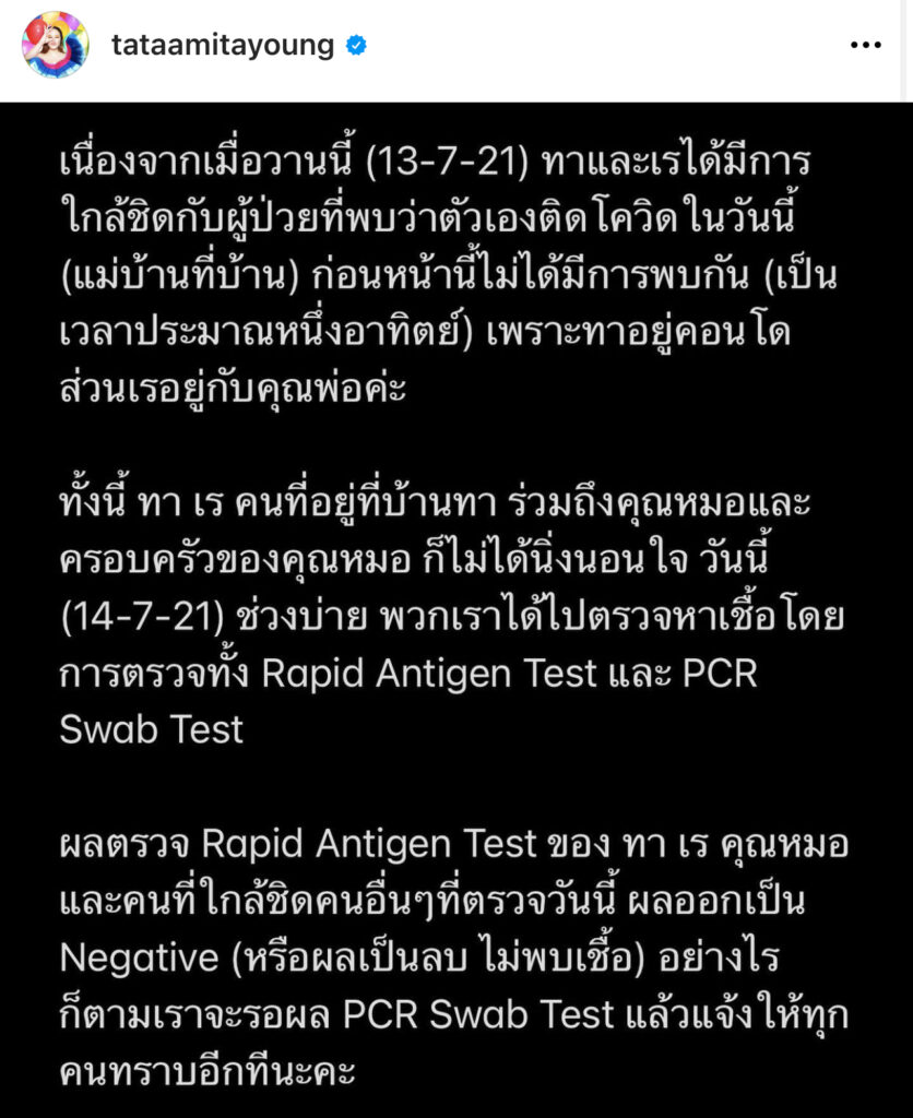“เนื่องจากเมื่อวานนี้ (13-7-21) ทาและเรได้มีการใกล้ชิดกับผู้ป่วยที่พบว่าตัวเองติดโควิดในวันนี้ (แม่บ้านที่บ้าน) ก่อนหน้านี้ไม่ได้มีการพบกัน (เป็นเวลาประมาณหนึ่งอาทิตย์) เพราะทาอยู่คอนโด ส่วนเรอยู่กับคุณพ่อค่ะ”