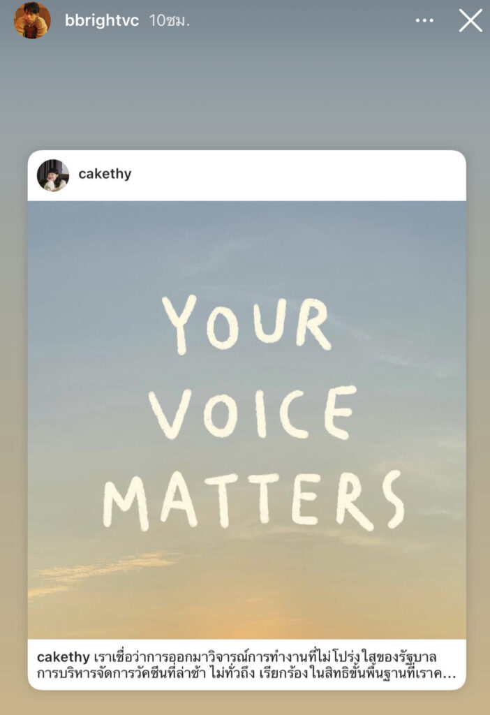 เรียกว่าคนบันเทิงยังคงเรียกร้องวิพากษ์วิจารณ์การทำงานของรัฐบาลอย่างต่อเนื่องและดุเดือดขึ้นทุกวัน ล่าสุดมาถึงคิวของนักแสดงวันรุ่นสุดฮอต ไบร์ท วชิรวิชญ์ ถึงจะไม่แสดงออกเยอะแต่ก็ฟาดเจ็บ โดยเจ้าตัวได้แชร์ภาพพร้อมแคปชั่นของผู้ใช้อินสตาแกรมท่านหนึ่งลงในไอจีสตอรี่ที่เขียนข้อความไว้ว่า ” เราเชื่อว่าการออกมาวิจารณ์การทำงานที่ไม่โปร่งใสของรัฐบาล การบริหารจัดการวัคซีนที่ล่าช้า ไม่ทั่วถึง เรียกร้องในสิทธิขั้นพื้นฐานที่เราควรได้รับ หรือแค่ พูดถึงสิ่งที่เราเห็นว่าไม่ถูกต้อง เป็นสิ่งที่เราสามารถทำได้ค่ะ และมันไม่ใช่แค่การพูดหรือด่าเพื่อความสะใจเท่านั้น แต่เราช่วยกันพูด เพื่อสร้างความเปลี่ยนแปลงให้กับสังคมได้ ถ้าเราอยากเห็นประเทศที่ดีขึ้น ทุกเสียงของทุกคนมีความหมาย ต่อให้มันจะเห็นผลช้ามาก แต่อย่างน้อยเราก็ได้เริ่มทำอะไรซักอย่าง ดีกว่าไม่ทำอะไรเลย