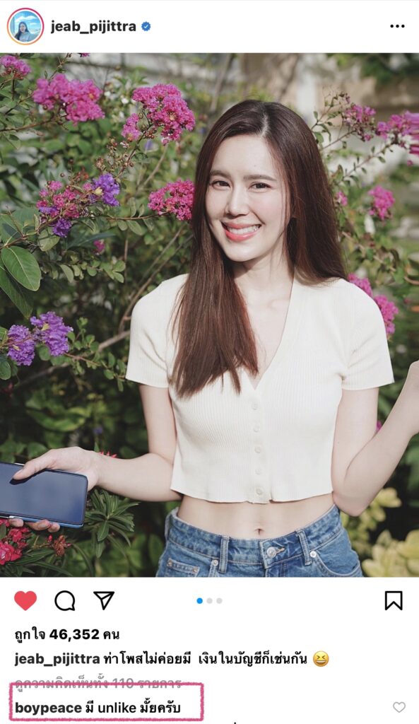 ถูกแฟนๆยกให้เป็นเจ้าแม่แคปชั่นที่ไม่ว่าจะลงรูปทีไรเป็นต้องมีวลีเด็ดชวนอมยิ้มไปซะทุกครั้ง สำหรับสาว เจี๊ยบ พิจิตตรา ที่ล่าสุดได้ลงรูปสุดน่ารักแอบเซ็กซี่หน่อยๆกับเสื้อเอวลอยนิดๆ พร้อมกับแคปชั่นเรียกรอยยิ้ม “ ท่าโพสไม่ค่อยมีเงินในบัญชีเช่นกัน ” งานนี้ทำเอาถูกอกถูกใจเหล่าๆแฟนๆต่างก็เข้ามากดไลฟ์รัวๆคอมเมนท์ชื่นชมในความน่ารักกันกระจาย แต่ที่ทำเอา สาวเจี๊ยบ แอบมีสะดุ้งก็เมื่อสามีสุดที่เลิฟ บอย พีซเมคเกอร์ ได้เข้ามาคอมเมนท์รูปนี้กับประโยคที่ว่า “ มี Unlike มั้ยครับ “ รู้แหละว่ารักถึงต้องมาทักเพราะหวงแบบนี้ จริงไหมจ๊ะ หนุ่มบอย