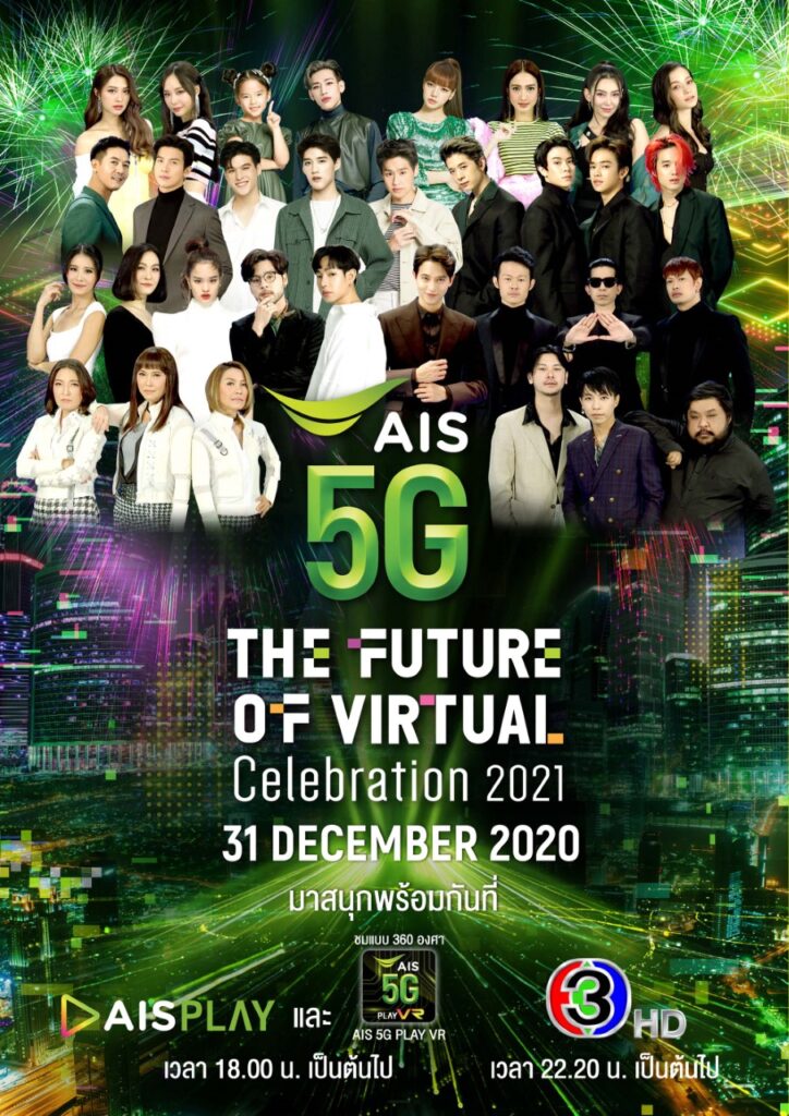 โดยคนไทยทุกคนทุกเครือข่าย สามารถรับชมคอนเสิร์ต “AIS 5G The Future of Virtual Celebration 2021” ไปพร้อมกันได้ในวันที่ 31ธ.ค.นี้ ที่ AIS PLAY พิเศษ! รับชมใกล้ชิดแบบ 360° ที่แอปพลิเคชัน AIS 5G PLAY VR และ AIS VR 4K เริ่มตั้งแต่เวลา 18.00 น. เป็นต้นไป หรือรับชมผ่านช่อง 3 HD กด 33 แบบไม่มีโฆษณาคั่น ตั้งแต่เวลา 22.20 น. เป็นต้นไป