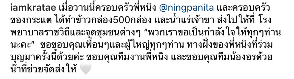 น้ำใจของคนวงการบันเทิงไม่หยุดนิ่งจริงๆ ยังคงเดินหน้าช่วยเหลือประชาชนและบุคลากรทางแพทย์ที่ได้รับผลกระทบจากสถานการณ์การแพร่ระบาดของเชื้อไวรัสโควิด-19อย่างต่อเนื่อง ล่าสุดนักแสดงสาวเพื่อนชี้กระแต ศุภักษร“-“หนิง ปณิตาก็ขอแท็กทีมช่วยเหลือประชาชนที่ได้รับความเดือดร้อนมอบถุงยังชีพและได้ทำข้าวจำนวน500กล่อง มอบให้กับชุนชมและโรงพยาบาลราชวิถี โดยได้โพสต์ภาพพร้อมแคปชั่นว่า